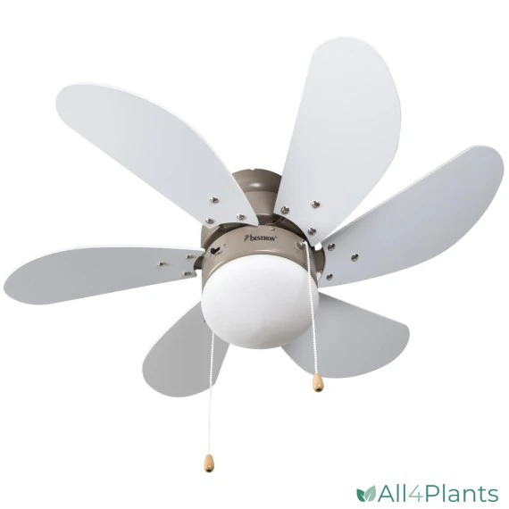 De Bestron DC30T plafondventilator past met titaniumkleurige behuizing en zijn omkeerbare ventilatorbladen in elk interier, een kant van de bladen is wit en de andere kant is hout/ahorn. Dankzij zijn 6 bladen en kopergewikkelde motor is de DC30T ventilator perfect om iedere slaapkamer geruisloos te verkoelen. Daarnaast is de DC30T ook voorzien van een E14 fitting voor een lamp van maximaal 60 watt. De bediening is zeer eenvoudig dankzij de twee trekkoorden.