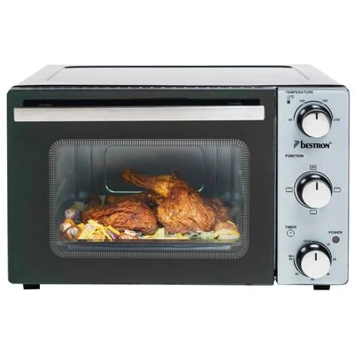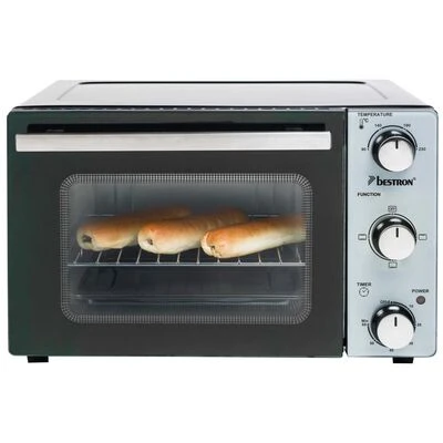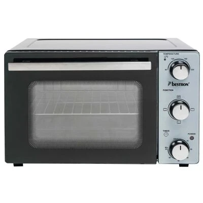 Deze Bestron convectieoven heeft 3 verschillende roosterhoogtes en werkt op basis van 4 verwarmingselementen die een gelijke hoeveelheid boven- en onderwarmte afgeven. De hittebestendige behuizing is uitgerust met een roestvrijstalen bedieningspaneel en een draaiknop voor het selecteren van boven- of onderwarmte. De 60-minuten timer met alarm is erg handig wanneer je door andere taken in de keuken wordt afgeleid. De dubbelwandige glazen ovendeur heeft een hittebestendige handgreep zodat je veilig kunt werken. De Bestron oven is heel eenvoudig te reinigen en is uitgerust met een indicatielampje en een automatische uitschakelfunctie.