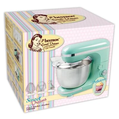 Deze keukenmachine AKM900M van Bestron is onderdeel van de Bestron Sweet Dreams serie. Hij is perfect voor het kneden van brooddeeg, het kloppen van beslag, het mengen van ingrediënten, het kloppen van eieren en mixen.