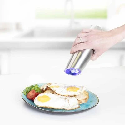 Deze compacte kruidenmolen is gemaakt van roestvrij staal en is buitengewoon duurzaam en comfortabel te gebruiken met één hand. Hij wordt gekenmerkt door een LED-lampje en een extra groot, stevig, transparant reservoir voor een duidelijk zicht op de inhoud. Bovendien voldoet de molen aan al je kruidenwensen in de keuken dankzij de verstelbare maalinstellingen van extra fijn tot grof. De pepermolen heeft een geavanceerde zwaartekracht start/stop-functie waardoor hij maalt als je hem omdraait. De peper- en zoutmolen werkt op 4 AAA-batterijen (niet inbegrepen bij levering).