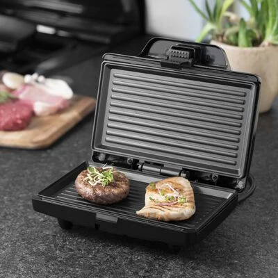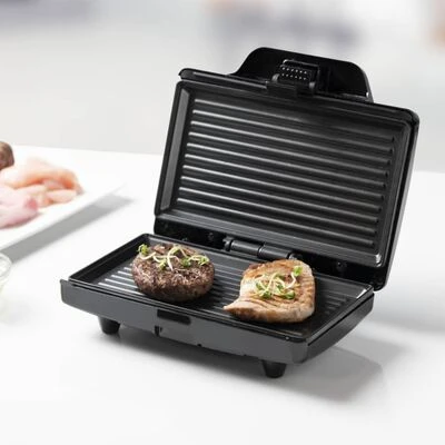 Hij heeft een compact ontwerp en is een uitstekende aanvulling op je keuken. De grillplaten zijn voorzien van een anti-aanbaklaag, hierdoor zijn ze afwasbaar en zeer makkelijk schoon te maken. Veiligheidsvoorzieningen zijn onder meer een aan- en gereed-indicatielampje.
